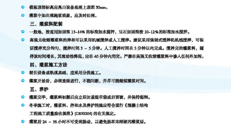 3、灌漿后24-36小時(shí)不可受到振動(dòng),以避免損壞未結(jié)硬的灌漿層。